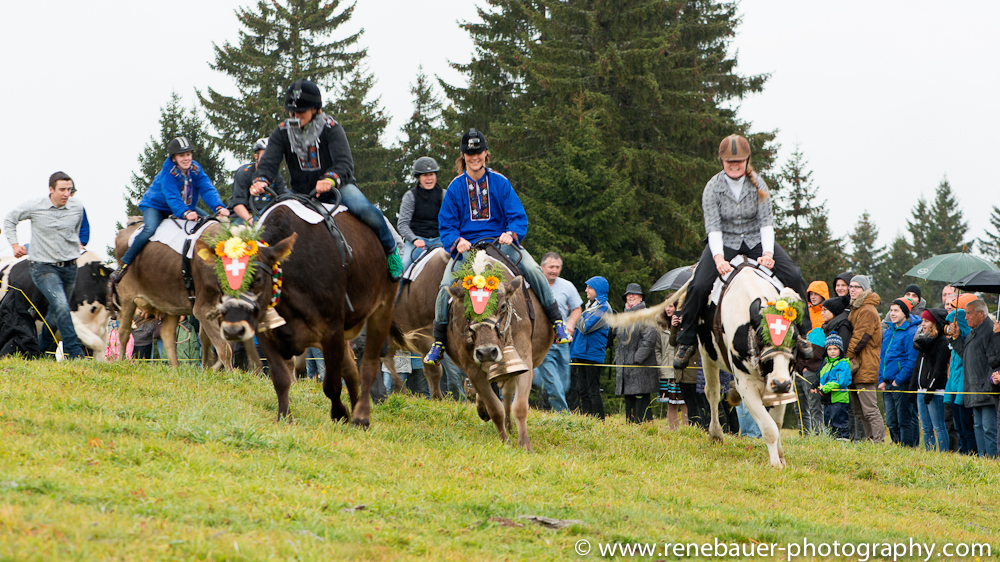 Zwischen Talnebel und dicken Wolken am Himmel sammelt sich das Volk zum alljährlichen Spektakel am Ende der Alpsaison. In Flumserberg/Schweiz trifft man sich bei Musik und lokalen Spezialitäten auf dem Käsemarkt. Ein Holzschnitzer, Streichelzoo und Schaukäserei bieten Unterhaltung und Abwechslung. Was die Leute aber trotz des Nieselregen hier hoch lockt ist das Kuhrennen. Einzeln werden die „Rennkühe“ und ihre Jockeys im Festzelt vorgestellt, damit das fachkundige Publikum Wetten abschliessen kann. Später werden die Kühe unter Alphornklänge zur Startlinie geführt. Während einige Tiere unerwartet schnell um den Parcours rennen, bleiben andere zum Frust der Reiter bockstill stehen. Da nützen alle aufmunternden Zurufe der Zuschauer nichts. Ein Treiber versucht jeweils die Kühe anzutreiben, zu schieben oder zu stossen. Irgendwann schaffen es alle Teilnehmer zum Ziel und die Sieger können gekürt werden. Neue Glocken zieren nun die Hälse, bzw Wände der Sieger.