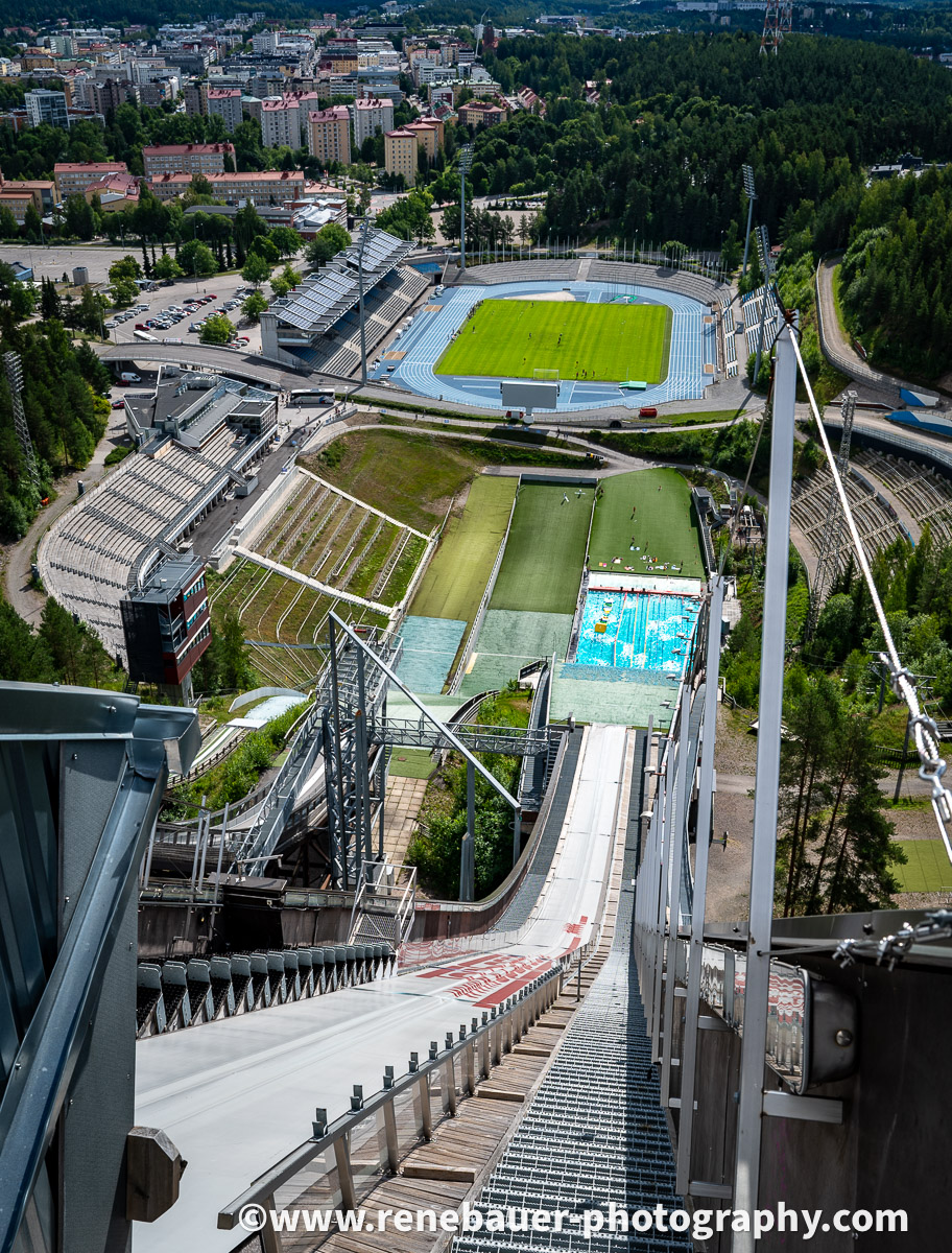 Next day i stood under the mighty pillars of the ski jump of Lahti. To my surprise it was possible to get up to the top. The view over the lakes and forests was stunning.