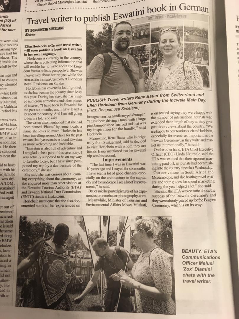 Das Interview mit dem ‚Eswatini Observer‘ brachten Ellen und mich tatsächlich in die Zeitung. Mit Fotos. Wenn auch Ellen die interessantere Interviewpartnerin ist, so freut es mich doch, dass mein Blog http://www.renebauer-photography.com erwähnt wurde. 😀
